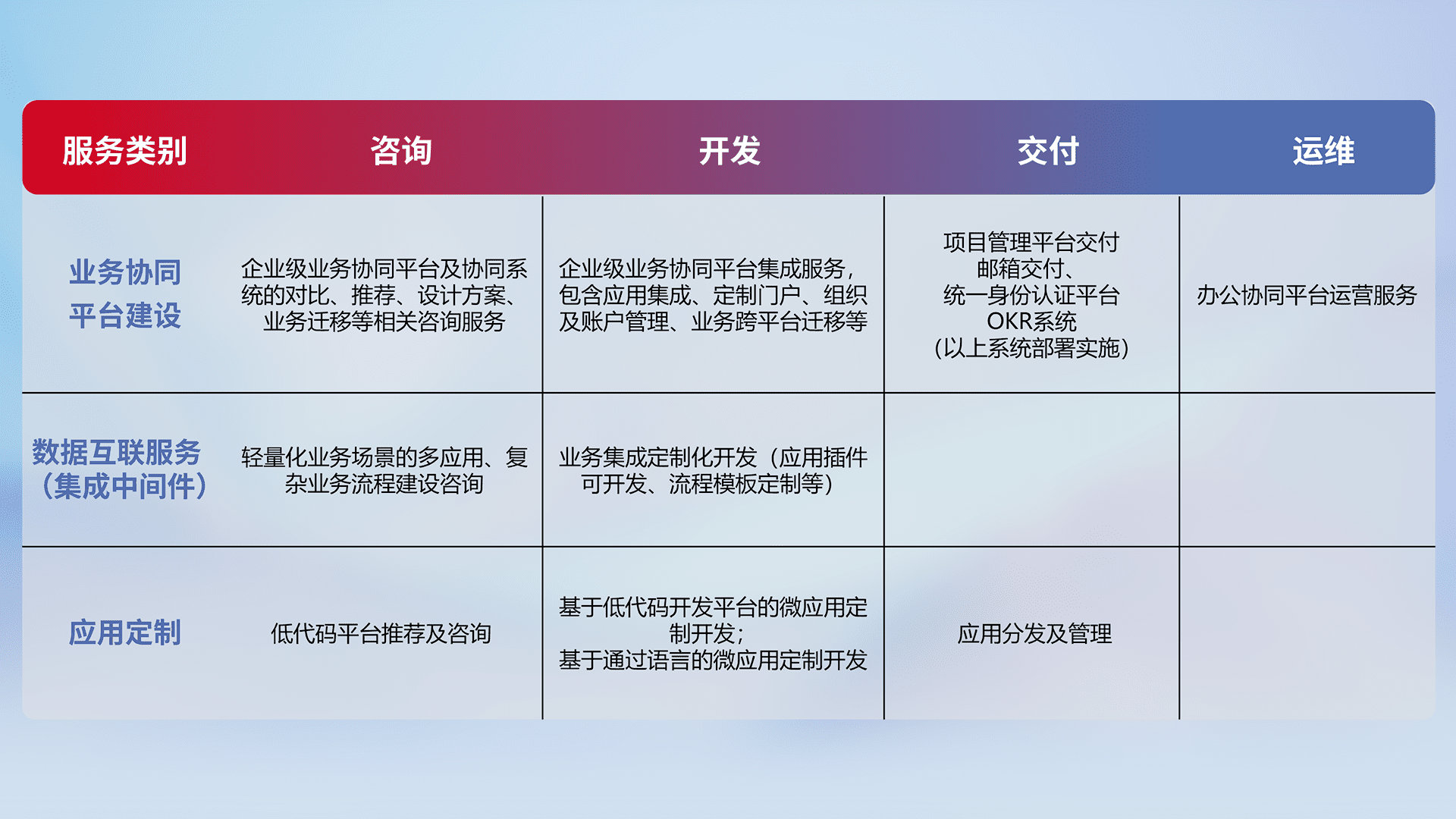针对钉钉、、企微、、、、IDaas等平台级产品提供产品的规划、、、、方案、、、交付、、、定制化开发等服务,,,,实现如统一协同办公、、、智能客户服务、、混合会议管理、、、智能数据查询、、、、等业务场景,,,实现数字化转型。。。