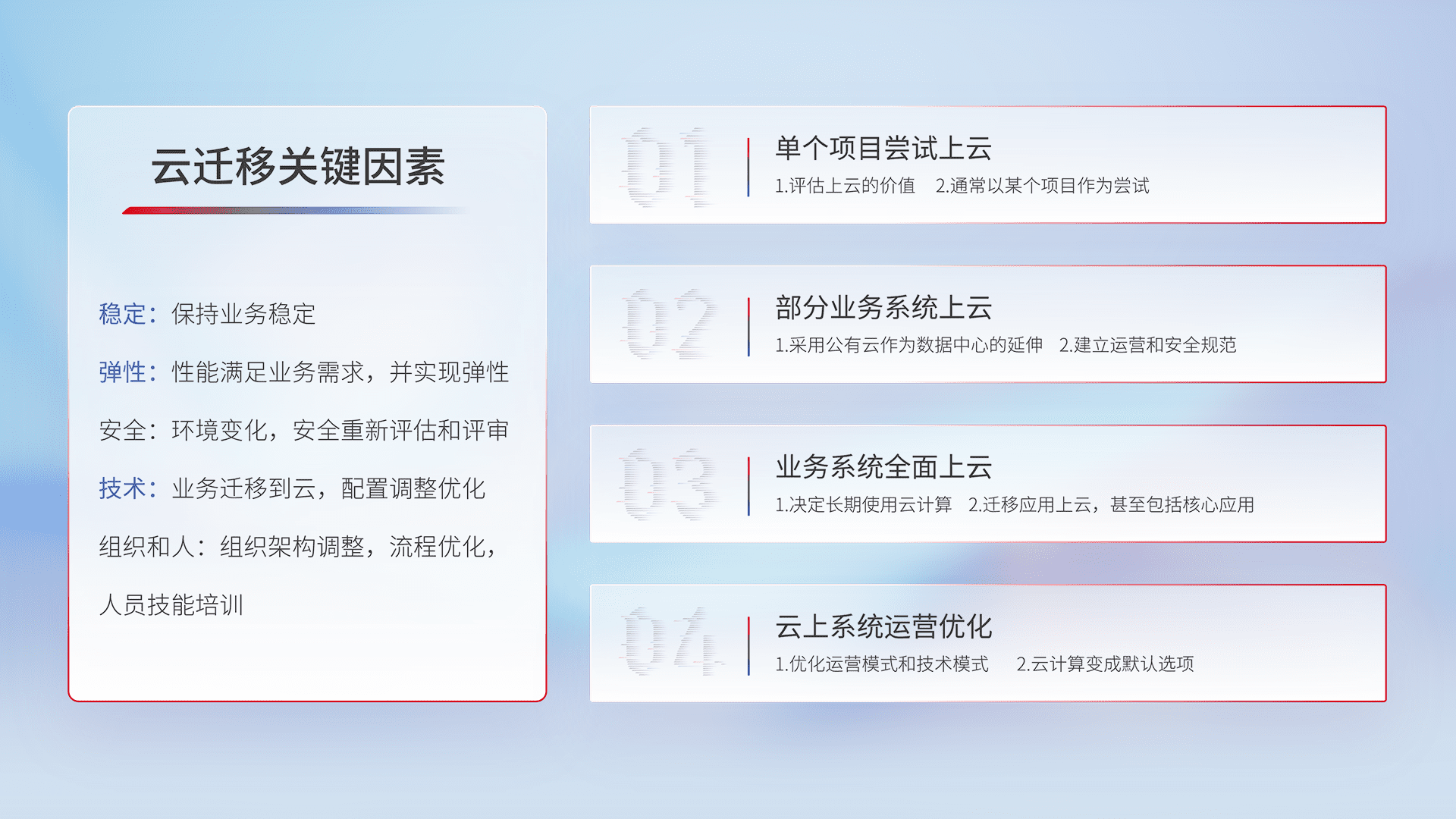 结合实际业务,,从规划设计、、、、云平台选型、、云原生改造、、、数据迁移、、、、集成交付,,迁移全过程为客户识别最佳上云路径,,,,做好风险识别管理,,设计网络架构、、、身份权限、、、、安全审计合规、、操作审计、、日志审计、、、监控告警策略、、多站点容灾设计等,,,,对云上基础设施进行整体规划,,,,提升IT治理水平,,,,以满足弹性、、、高可用、、高性能的需求。。