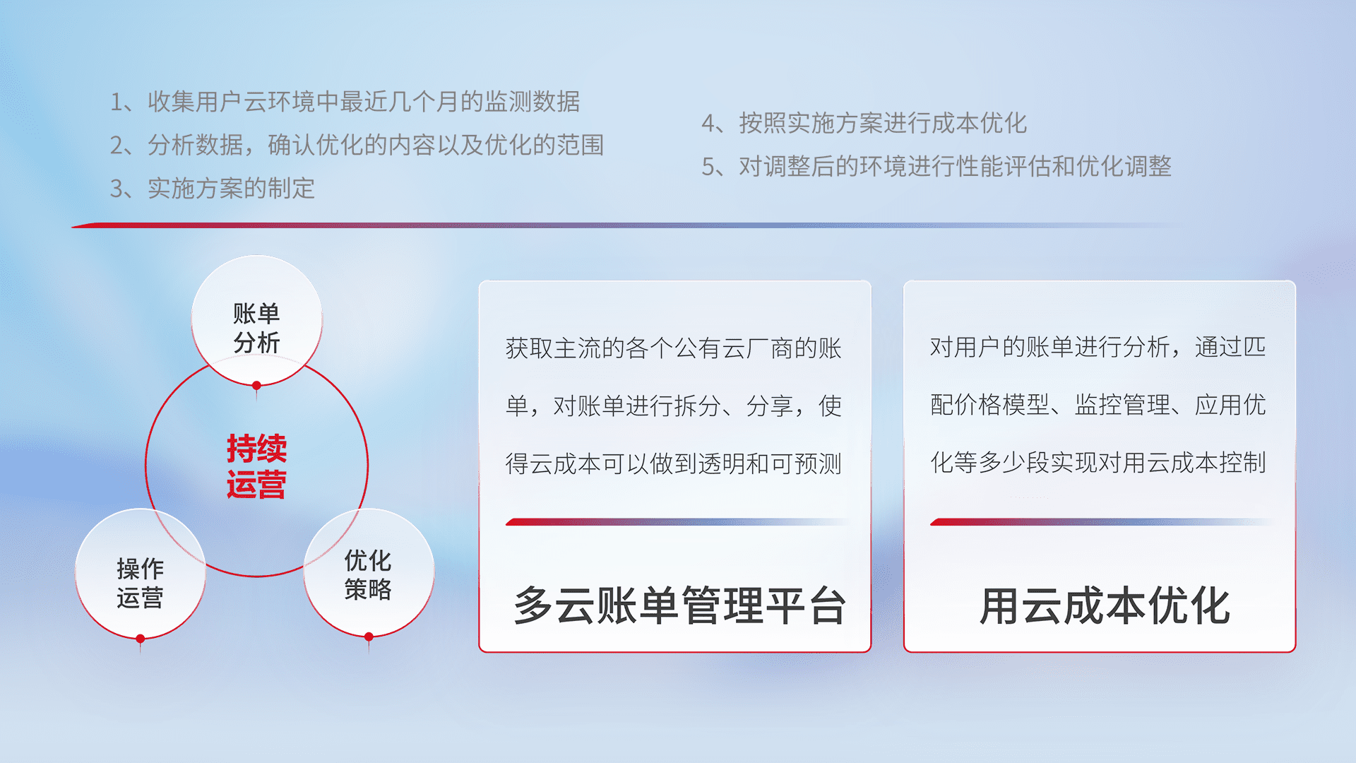 通过多云纳管,,以统一的资源数据模型把客户的云资源进行抽象和封装,,,进而实现对多云资源的统一操作,,,保障云资源管理的可靠性、、、稳定性与可用性。。量身定制化运维内容,,配置、、、、开发运维、、补丁管理、、备份、、监控、、、认证和访问管理、、审计和日常巡检等,,,保障在用云过程中的可靠度,,,,稳定度以及高可用率。。。。