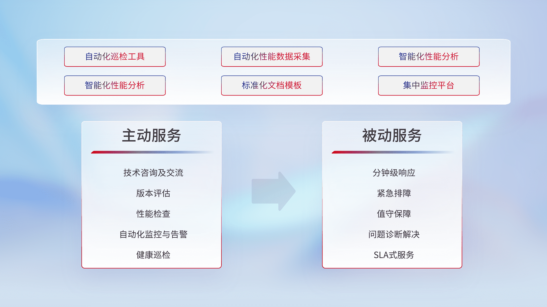 智能化工具和标准化文档,,,,保障服务质量,,,,提供主动服务(包含技术咨询、、版本评估、、、、性能检查、、、、自动化监控与告警、、、健康巡检)和被动服务包含(分钟级响应、、紧急排障、、值守保障、、、问题诊断解决、、、、SLA服务)。。。。